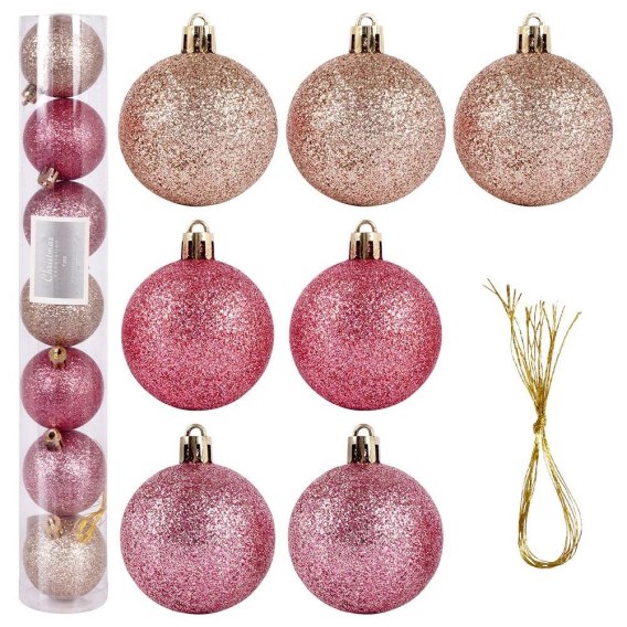 - ŚWIĄTECZNE - Zestaw 7 sztuk bombek wraz ze sznureczkiem do zawieszenia. Każda z bombek ma średnicę 5 cm. W zestawie bombki w trzech odcieniach różu w wersji brokatowej.