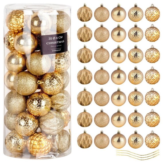 Zestaw 35 sztuk nietłukących bombek. W zestawie: 7x złote bombki wytłaczane matowe, 7x złote bombki brokatowe, 7x złote bombki wytłaczane brokatowe, 14x złote bombki wytłaczane złote w dwóch wzorach . Bombki prezentują się bardzo efektownie. Niezbędne do dekoracji choinek, kompozycji świątecznych i stroików. Będą stanowić wyjątkową ozdobę na choince. Z ich pomocą możemy w modnym stylu ubrać swoje drzewko świąteczne.