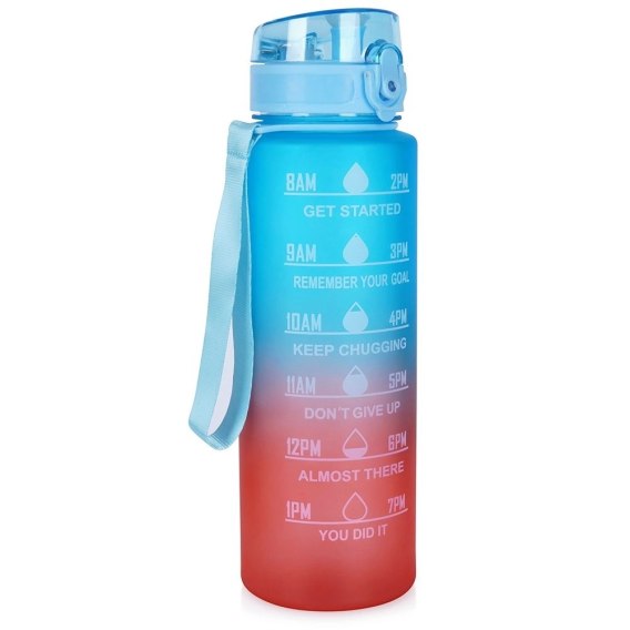 <li><strong>MOTYWUJĄCA</strong> - Bidon doskonale sprawdzi się jako butelka do monitorowania spożywania odpowiedniej ilości wody w ciągu dnia. Posiada miarkę w ml od 100 do 900 ml (z podziałką co 100 ml) oraz podziałkę w fluid ounces (fl. oz). Dodatkowo, na powierzchni butelki umieszczone zostały motywujące napisy z godzinami, które przypominają o kolejnych łykach wody.</li>
