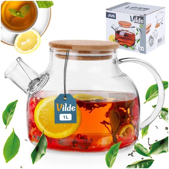 Dzbanek do napojów z sitkiem oraz bambusową pokrywką. Można w nim zaparzać zioła, herbaty oraz podawać lemoniady, gorące lub mrożone kawy, a także grzane wino. Dzbanek ma wymiary 20 x 13,5 x 13 cm i pojemność 1 l.