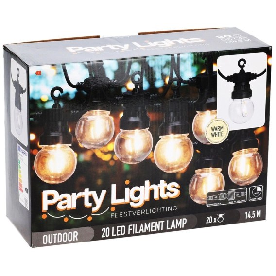 ⭐ Dane techniczne - Odległość między żarówkami wynosi 50 cm. Długość kabla z lampkami wynosi 9,5 m. Łączna długość przewodu wynosi 14,5 m. Girlanda jest zasilana sieciowo, posiada zabezpieczenie IP44, jest odporna na warunki atmosferyczne.
