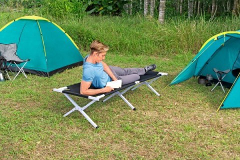 Łóżko kempingowe ma solidną stalową ramę, malowaną na biało. Jest składana, co pozwala zaoszczędzić miejsce, a jej trwała konstrukcja sprawia, że doskonale nadaje się do użytku na zewnątrz, nawet w trudnych warunkach atmosferycznych.