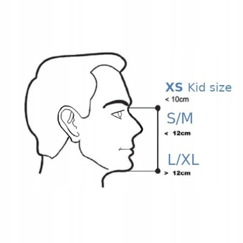 Jeśli odległość między brodą a nasadą nosa jest mniejsza niż 12 cm i większa niż 10 cm, zalecamy zakup rozmiaru S / M.