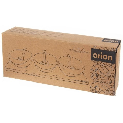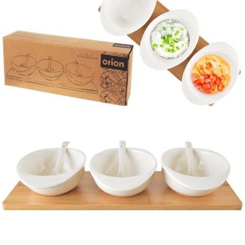 <p>Zestaw trzech miseczek z łyżeczkami na bambusowej tacy. Wykorzystamy je do serwowania przekąsek, przystawek, sosów i dipów. Zestaw pięknie prezentuje się na stole. Serwowane sosy lub przekąski są umieszczone w jednym miejscu, dzięki czemu wygodnie je przeniesiemy. Miseczki wykorzystamy podczas rodzinnych uroczystości i spotkań ze znajomymi. Przydadzą się również do serwowania sosów podczas grillowania. Zestaw sprawdzi się do użytku domowego oraz profesjonalnego. Idealny pomysł na prezent np. z okazji parapetówki. <strong>Oryginalny produkt czeskiej marki Orion.</strong> Wyprodukowano zgodnie z europejskimi standardami.</p>