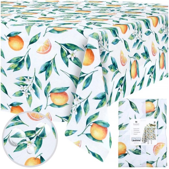 Obrus wykonany z poliestru w kolorze białym z liśćmi i owocami pomarańczy. Praktyczny w codziennym użytkowaniu oraz idealny na specjalne okazje.