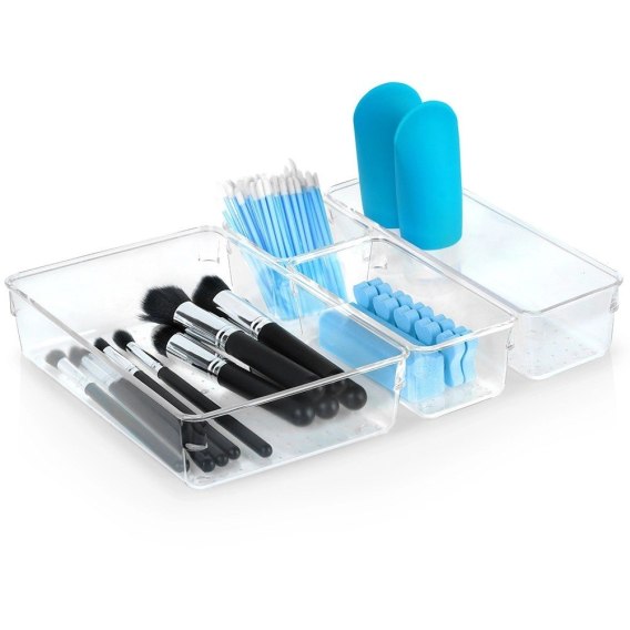<li><strong>4 oddzielne pojemniki dla lepszej organizacji</strong> - Pojemnik do przechowywania kosmetyków do makijażu, ale również biżuterii. Przydatny zarówno w domu jak i w salonie kosmetycznym. Zestaw składa się z czterech pojemników o różnych wymiarach.</li>