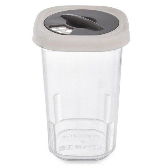Pojemnik na przyprawy z pokrywką posiadającą wygodne dozowniki. Można przechowywać w nim również produkty sypkie np. cukier puder, posypki, itp. Pojemnik ma wymiary 7,2 x 7,2 x 11,5 cm i pojemność 320 ml.
