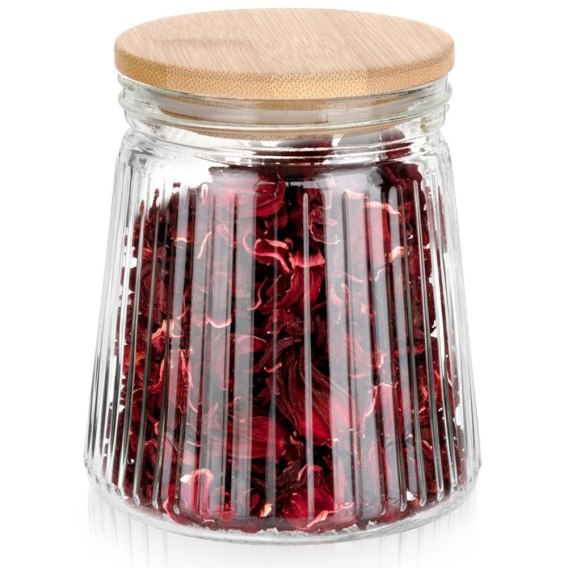 • Odporne szkło i drewniana pokrywka - Pojemnik wykonany ze szkła borokrzemowego, które cechuje się dużą odpornością na zmianę temperatur. Szkło ma eleganckie zdobienia w postaci ryflowanej powierzchni, co nadaje mu efektowny wygląd. Pokrywka wykonana z drewna bambusowego.