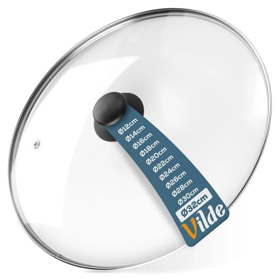 Szklana pokrywa ze stalową obręczą i uchwytem. Pokrywka ma średnicę 32 cm i wysokość z uchwytem 8 cm. Można ją użyć do pokrycia każdego rodzaju garnków, patelni i rondli w tym rozmiarze.