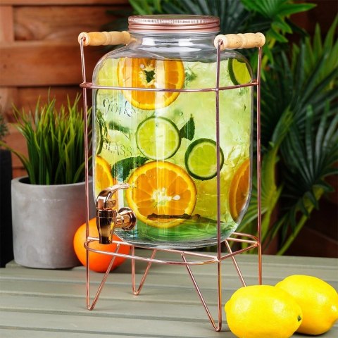 <li><strong>IDEALNY DO NAPOJÓW</strong> - Dystrybutor do napojów z kranikiem o pojemności 5,5 l w zestawie ze stojakiem. Słój ma wymiary: 22,5 x 15,5 x 27 cm. Stojak ma wymiary: 21,5 x 18,5 x 34,5 cm. Całkowity wymiar zestawu, czyli stojaka z postawionym na nim słojem z kranikiem wynosi 22,5 x 21,5 x 36 cm. Idealny do serwowania lemoniady w gorące dni, ponczu lub soku podczas imprezy.</li>
