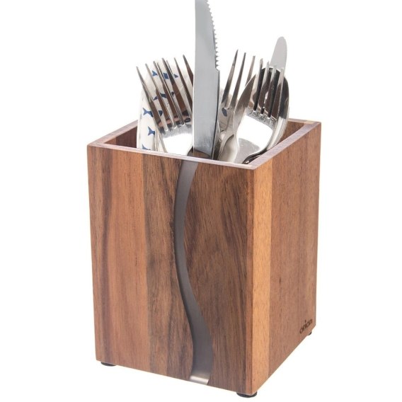 Drewniany stojak na przybory kuchenne, idealny do przechowywania łyżek kuchennych, łopatek, a nawet sztućców. Organizer na przybory o wymiarach 10 x 10 cm i wysokości 13,5 cm. Sprawdzi się w każdej kuchni. Stojak z serii River.