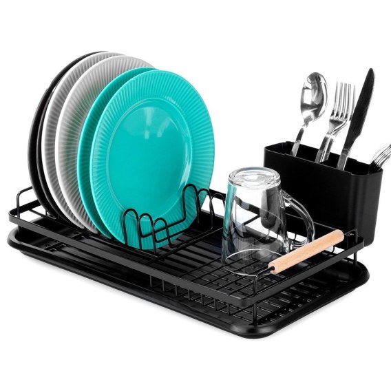 Kompaktowa suszarka na naczynia z miejscem na talerze, kubki oraz sztućce. Wykonana z wytrzymałych materiałów. Dzięki niej zapomnisz o nieuporządkowanych naczyniach i mokrych śladach na blacie szafek przy zlewie. Suszarka to niezbędny element wyposażenia kuchni. Wykonana w eleganckim stylu, a zarazem funkcjonalna. Łatwa w czyszczeniu. Posiada wyjmowaną tacę ociekową, dzięki czemu utrzymanie jej w czystości nie stanowi problemu.