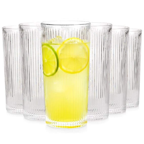 Komplet sześciu wysokich szklanek do napojów o pojemności całkowitej 320 ml. Wysokość każdej szklanki wynosi 15 cm, a średnica 7,3 cm.