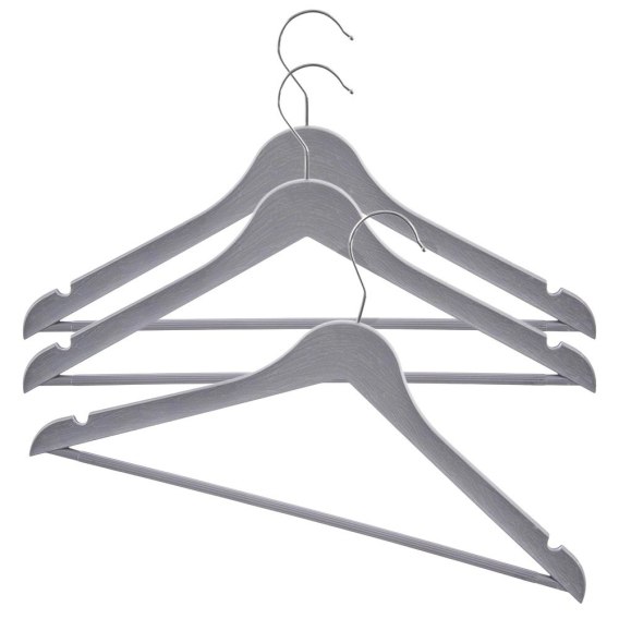 Zestaw 3 uniwersalnych wieszaków na ubrania w kolorze szarym. Idealne dla osób ceniących praktyczne rozwiązania, pomogą zorganizować odpowiednio przestrzeń w szafie. Wieszaki są niezbędne w każdym domu a także sklepie z odzieżą. Dzięki nim wygodnie zawiesimy ubrania w szafie. Każdy wieszak ma wymiary 42,5 x 24 x 1 cm.