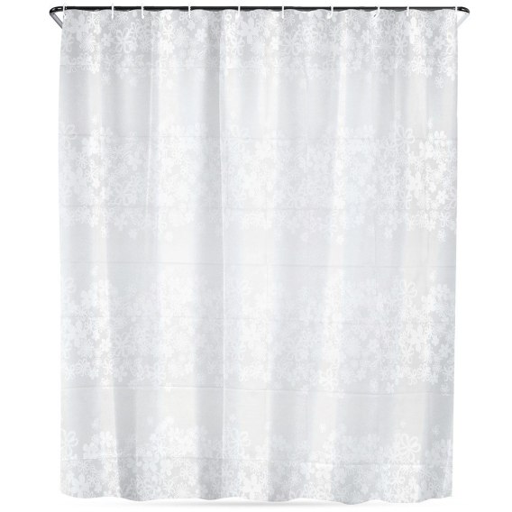 Zasłona wykonana z ekologicznego materiału PEVA, który jest wolny od szkodliwych substancji chemicznych, dzięki czemu jest bezpieczny dla zdrowia i środowiska. Zasłona w białym kolorze z kwiatowym motywem. Folia PEVA jest przyjazna dla środowiska, gdyż ulega całkowitej biodegradacji. Haczyki wykonane z tworzywa w białym kolorze.